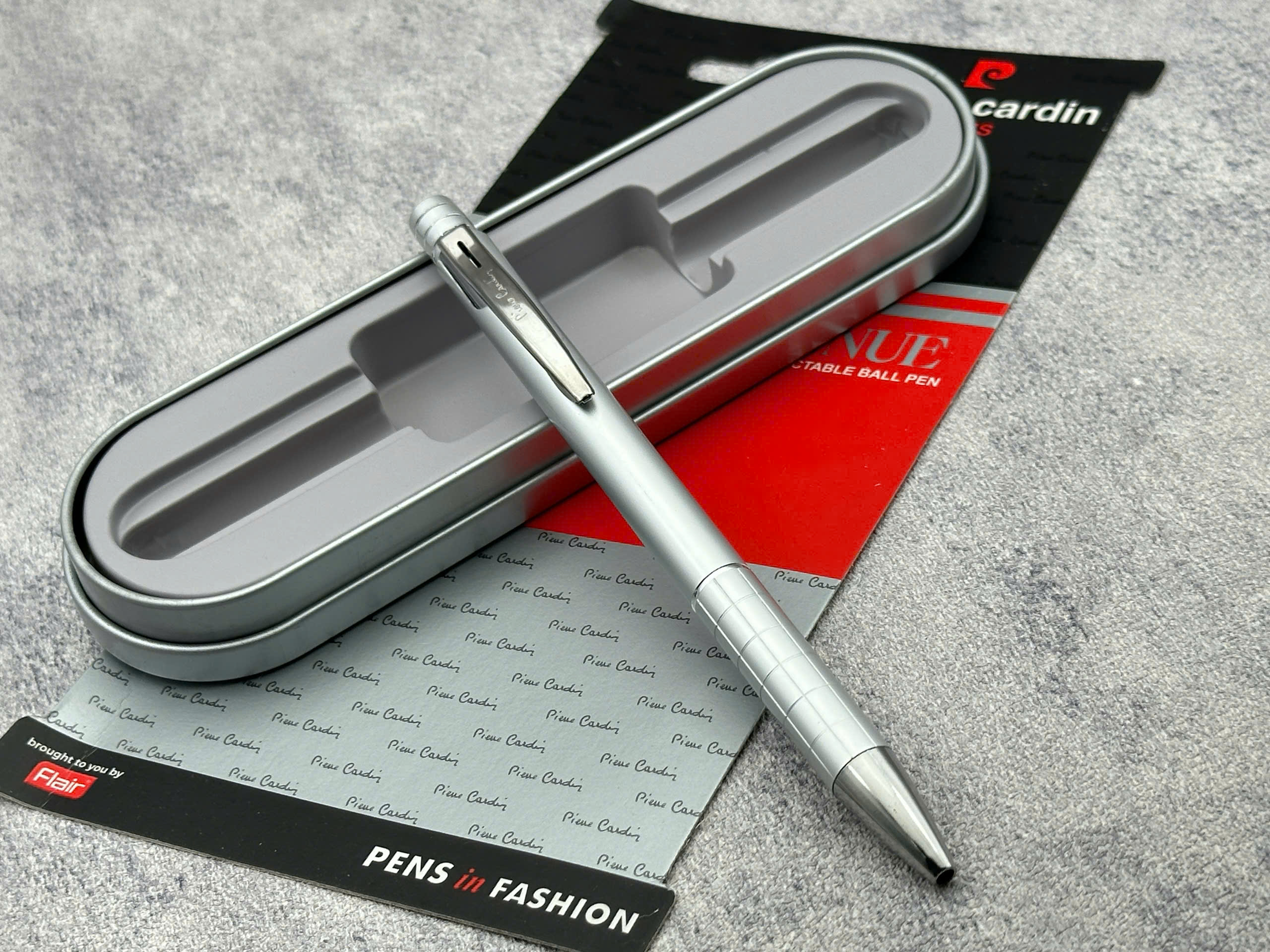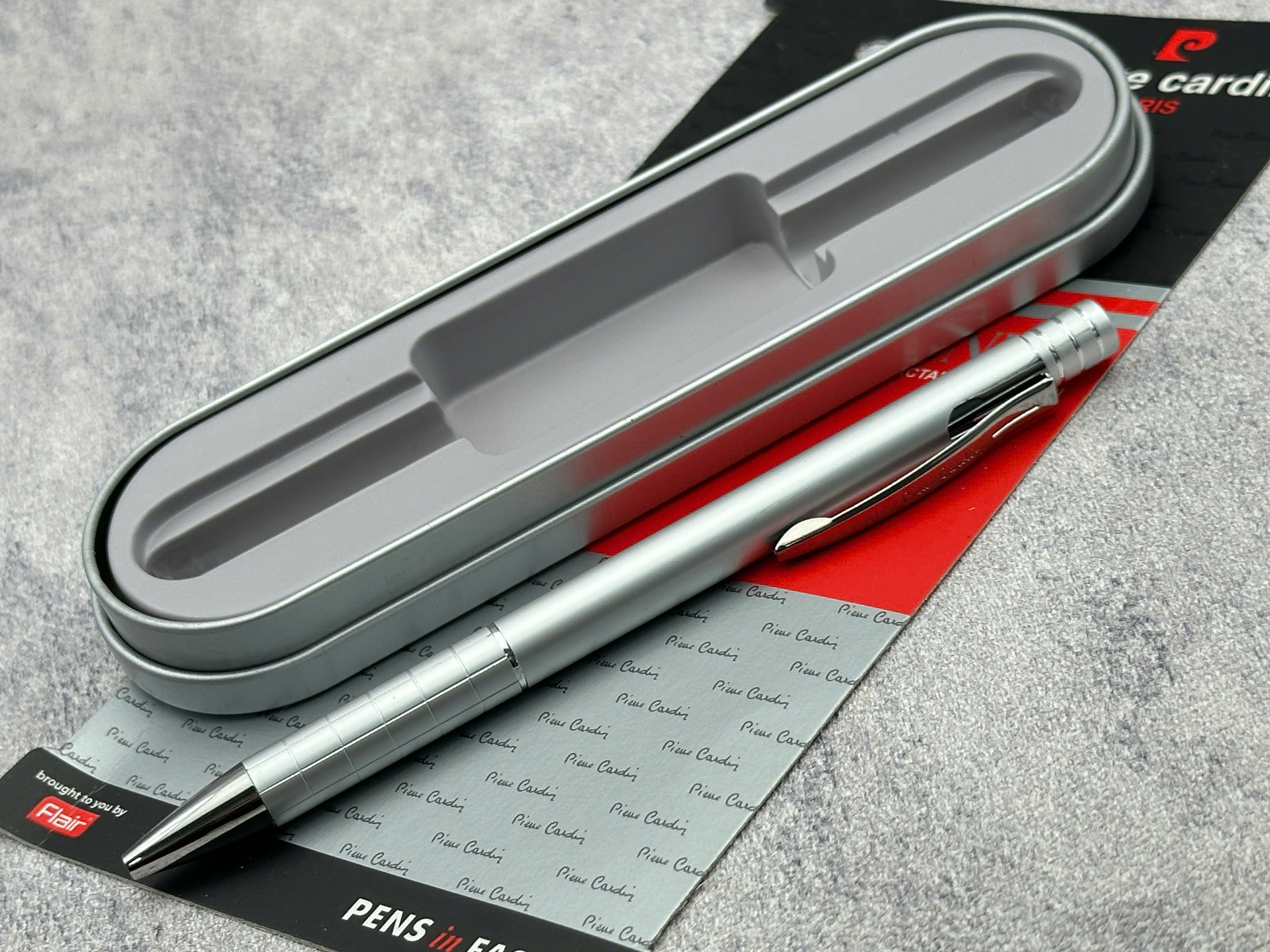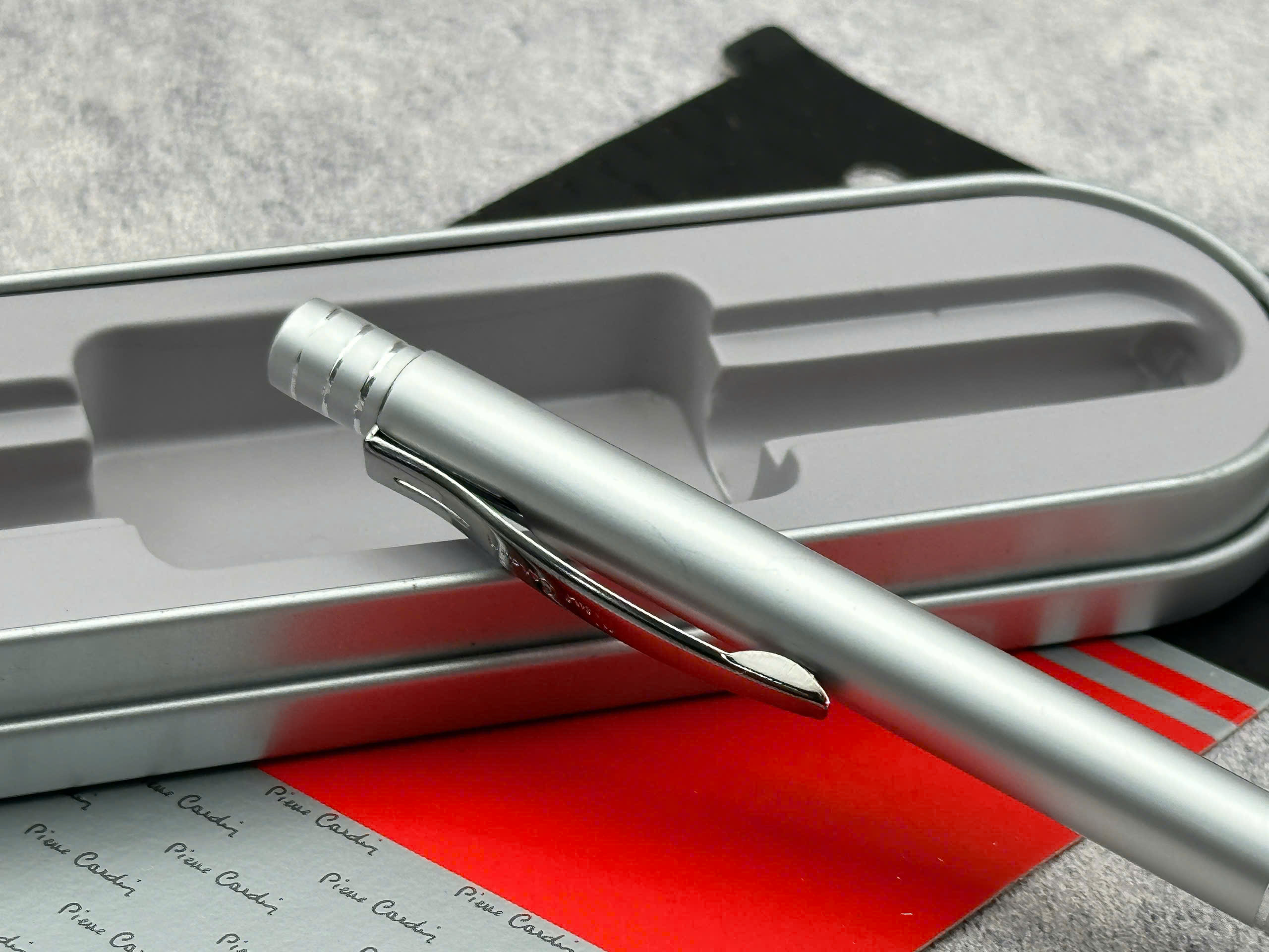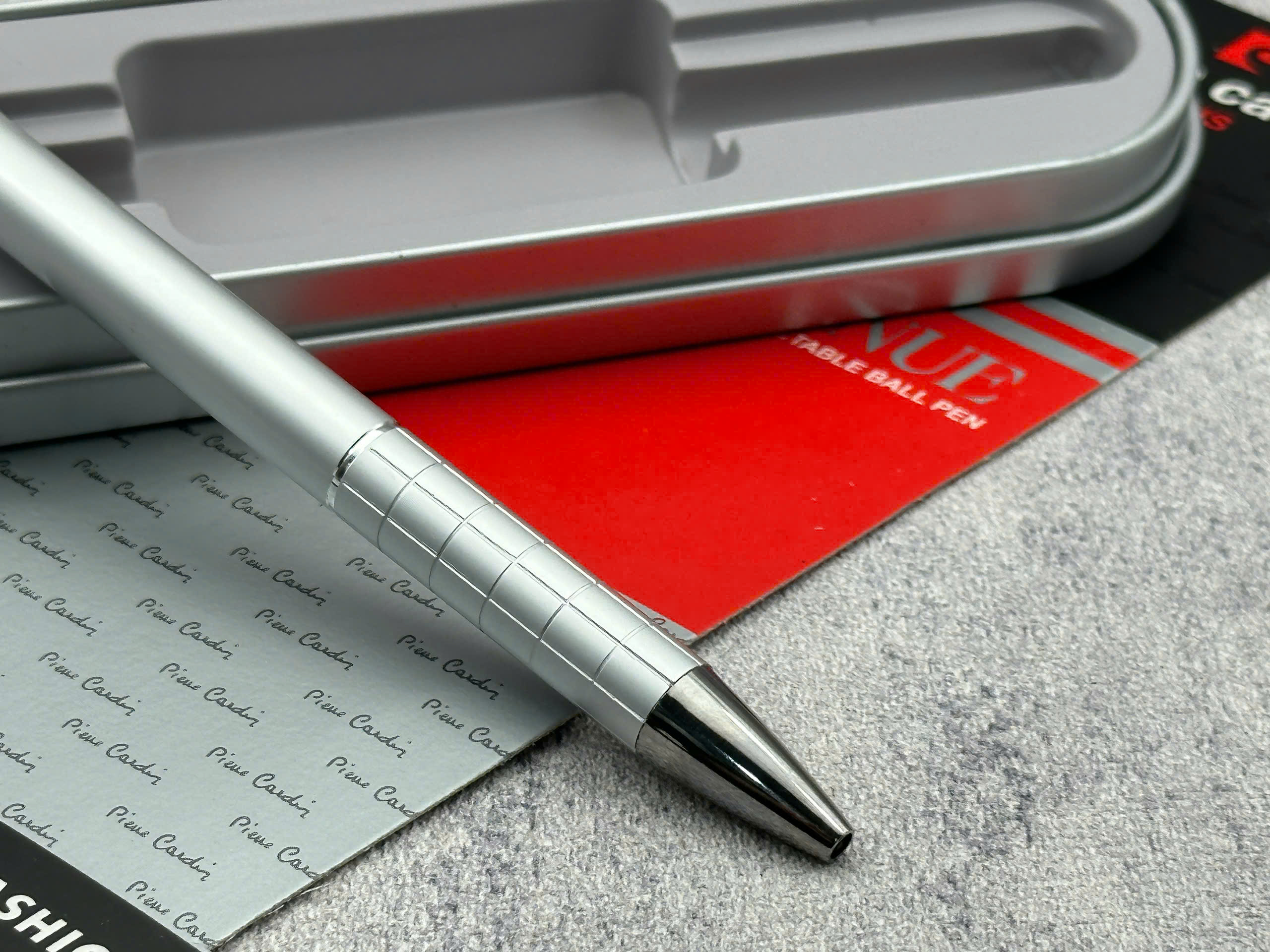 – Logo Pierre Cardin khắc nổi bật trên hộp, khẳng định thương hiệu cao cấp.