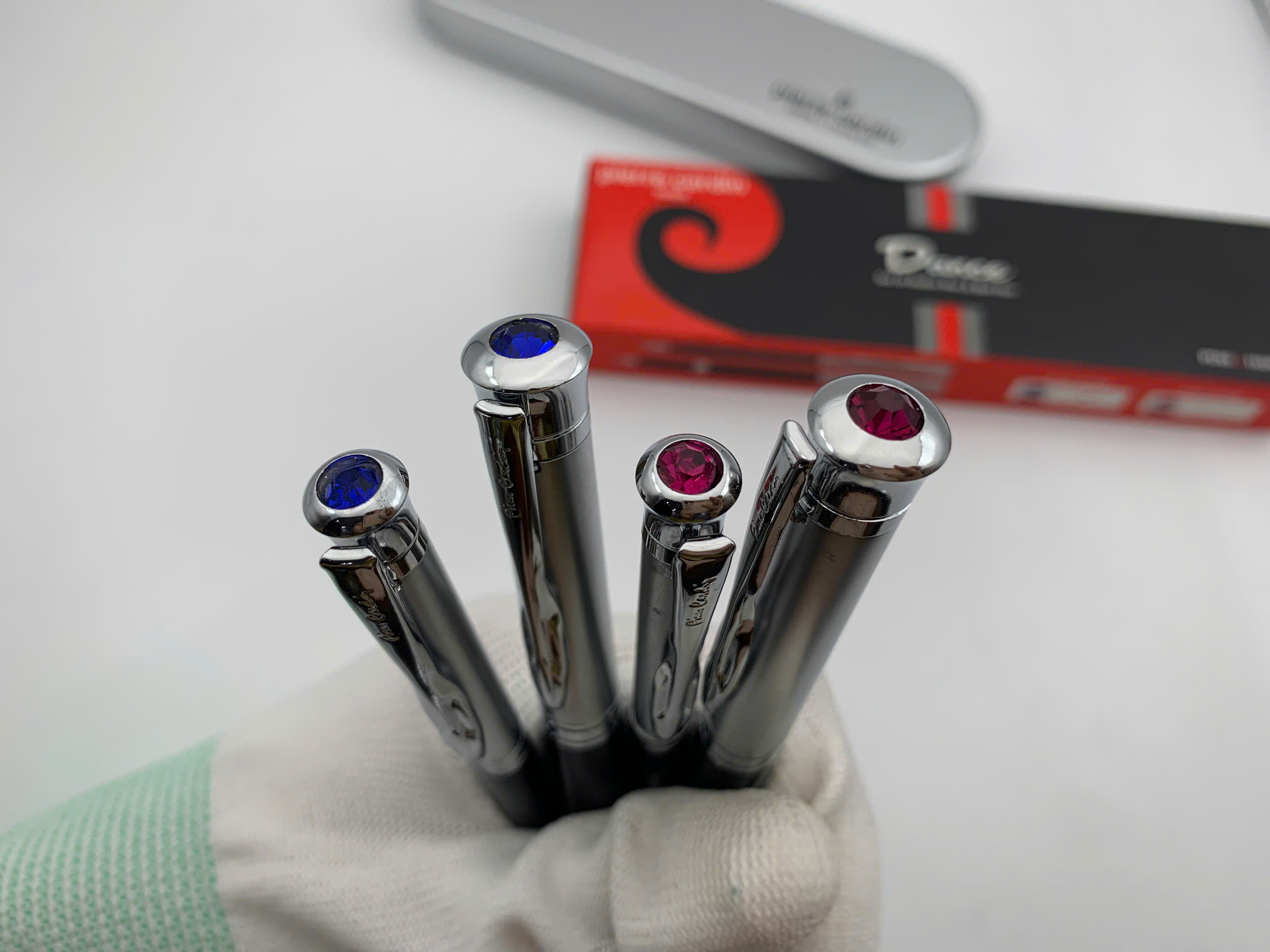 – Đỉnh bút có đính đá trang sức với hai màu đá xanh và đỏ làm điểm nhấn.